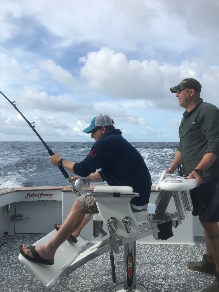 At around 0700 and after a two-plus hour run offshore in moderate-heavy seas (8 -10 foot+), I was walking from the starboard side bait box to the port side fighting chair where one of my friends was sitting and chilling. The boat took a rouge wave as I was walking and next thing I know I’m laying out on the deck staring at the sky, not knowing where I was and who the ugly guy was looking at me.