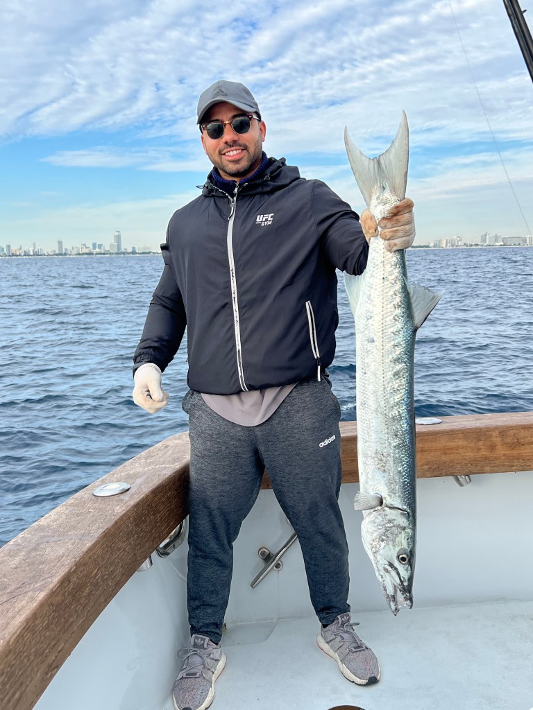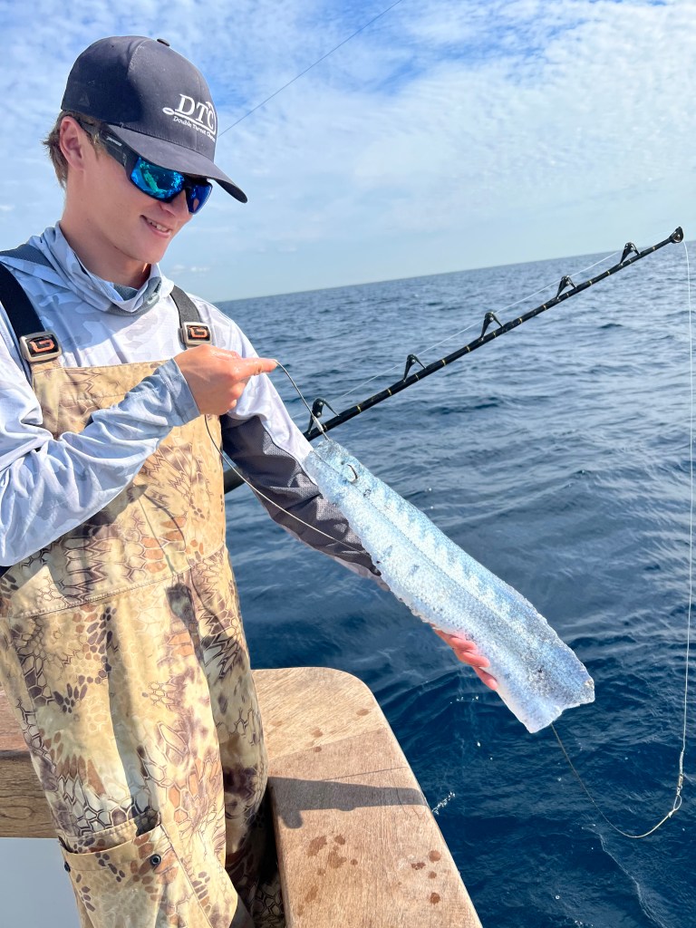 My friend, Mark, his first time fishing, caught a big barracuda which we later used for shark bait.