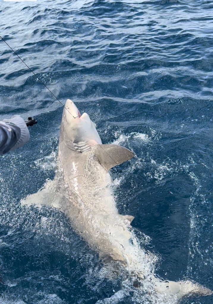 We went 2 for 3 on the sharks with Mark landing a massive 300 pound bull shark in about 115 feet of water. The bull had a tag and we attempted three times to remove the tag from the shark In the water before finally succeeding. Shark was not happy we were trying to remove the tag.