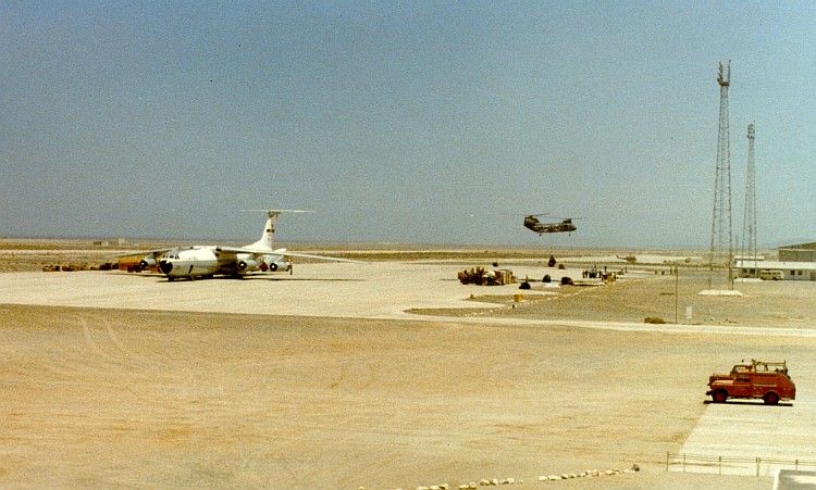 Long and hot days unloading pallets from cargo planes for helicopters to ferry to our ship and boring hot nights is how I remember Masirah Island.