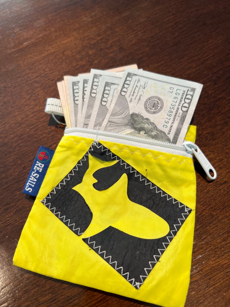 So I need a lucky pouch for my fishing bucks. I bought this pouch at a sail shop in Newport RI that sold recycled sail cloth as boat bag accessories. Tough, waterproof and cool looking.