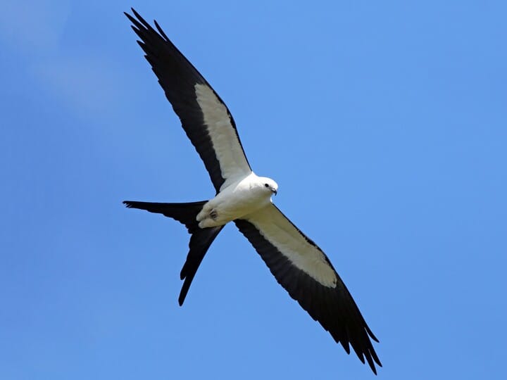Swallow-tailed Kites are large raptors. They have long, narrow, pointed wings, slim bodies, and a very long, deeply forked tail. The bill is small and sharply hooked like other raptors.