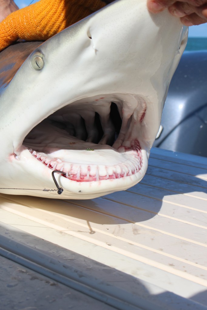 Once the shark grabs the bait and runs, it’s game on. Depending on the shark species and size a fight can be anywhere from 15 minutes to over an hour. Once at the boat, these beasts are never really beaten and first and foremost is everyone’s safety, including the sharks. We take a few pictures then cut the wire leader and off the shark goes. The metal circle hook will shortly rust out.