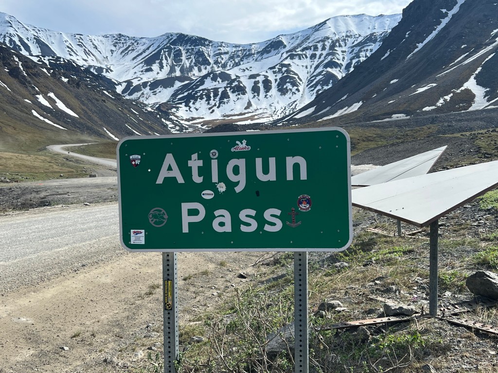 Atigun Pass (68° 7′ N, 149° 28′ W), is a high mountain pass across the Brooks Range and It’s where the Dalton Highway crosses the Continental Divide. On the north side of the pass begins the North Slope and tundra plains all the way to the Arctic Ocean.