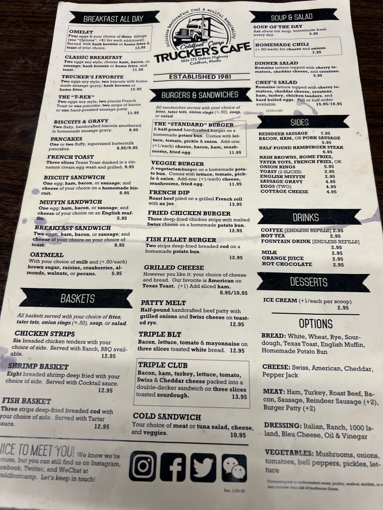 I enjoyed my dinners in Alaska from Homer to Fairbanks from seafood to pizza and burgers as well as a few homemade dinners in Wiseman and the buffet at Coldfoot truck stop.