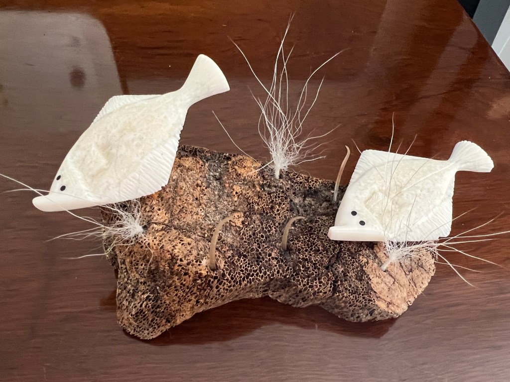 To commemorate my Halibut fishing trip I purchased original native Alaskan art of two halibut made from hand carved walrus ivory. The base is a whale bone decorated with polar bear fur and baleen. Only native Alaskans can harvest and use these materials in traditional art works.